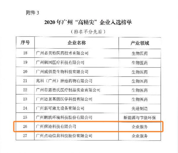 1月6日,由广州市科学技术局指导,广州市科技创新企业协会、《快公司Fast Company》联合举办的《2020发现广州“独角兽”创新企业榜单》正式公布,探迹科技同时荣获广州“未来独角兽”创新企业和“高精尖”企业称号,成为榜单中唯一一家同时入围两个奖项的企业服务公司。