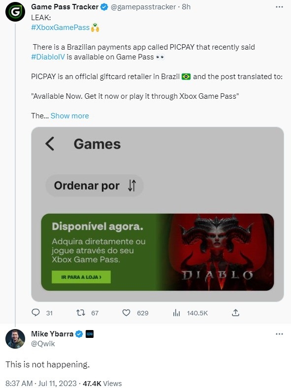 之前巴西的官方礼品卡零售商PicPay的App中有横幅广告显示,《暗黑破坏神4》已加入到Game Pass,现在可通过XGP游玩。不过该广告很快被移除...